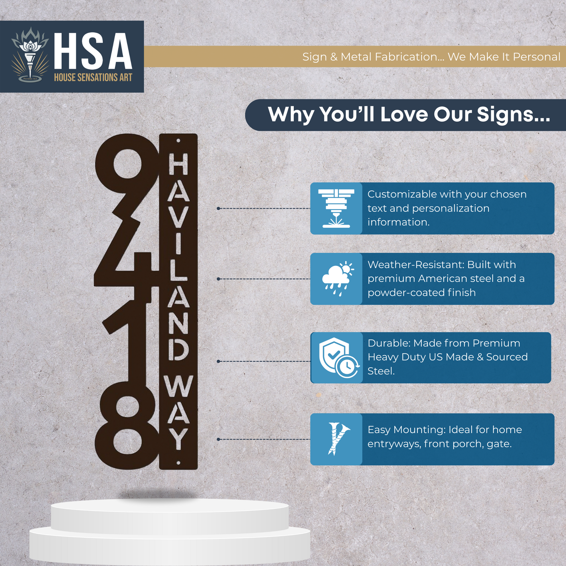 A custom metal address sign is a personalized sign crafted from high-quality metal that displays your home’s address. It adds a unique and durable touch to your exterior decor, making your property stand out while offering clear visibility for visitors and delivery services.