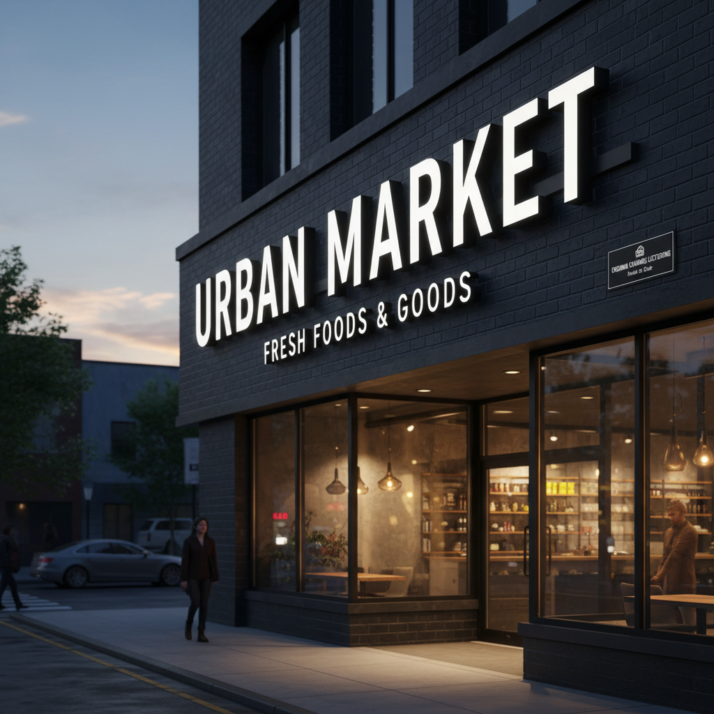 Transform your storefront into a neighborhood landmark. As seen with "Urban Market," our bold front-lit channel letters offer high-contrast visibility against dark, industrial exteriors like charcoal brick. These signs are engineered for maximum legibility from a distance, ensuring that your "Fresh Foods & Goods" are noticed by every passerby, day or night.