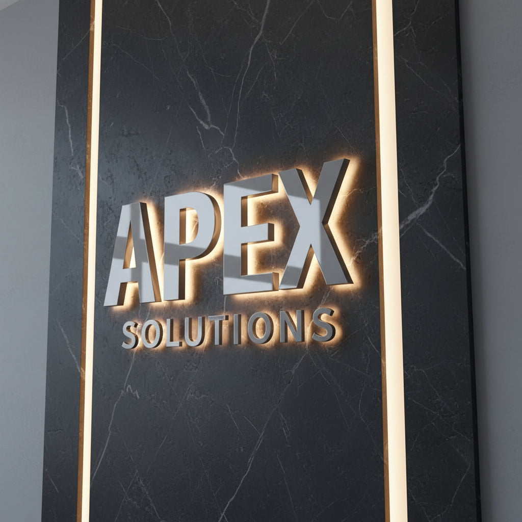 First impressions are everything in the corporate world. The "Apex Solutions" concept demonstrates how front-lit acrylic lettering mounted on dark, professional wood or matte finishes creates a sense of authority and clarity. These signs aren't just displays; they are landmarks for your business that signal reliability and modern innovation to every client who walks through the door.