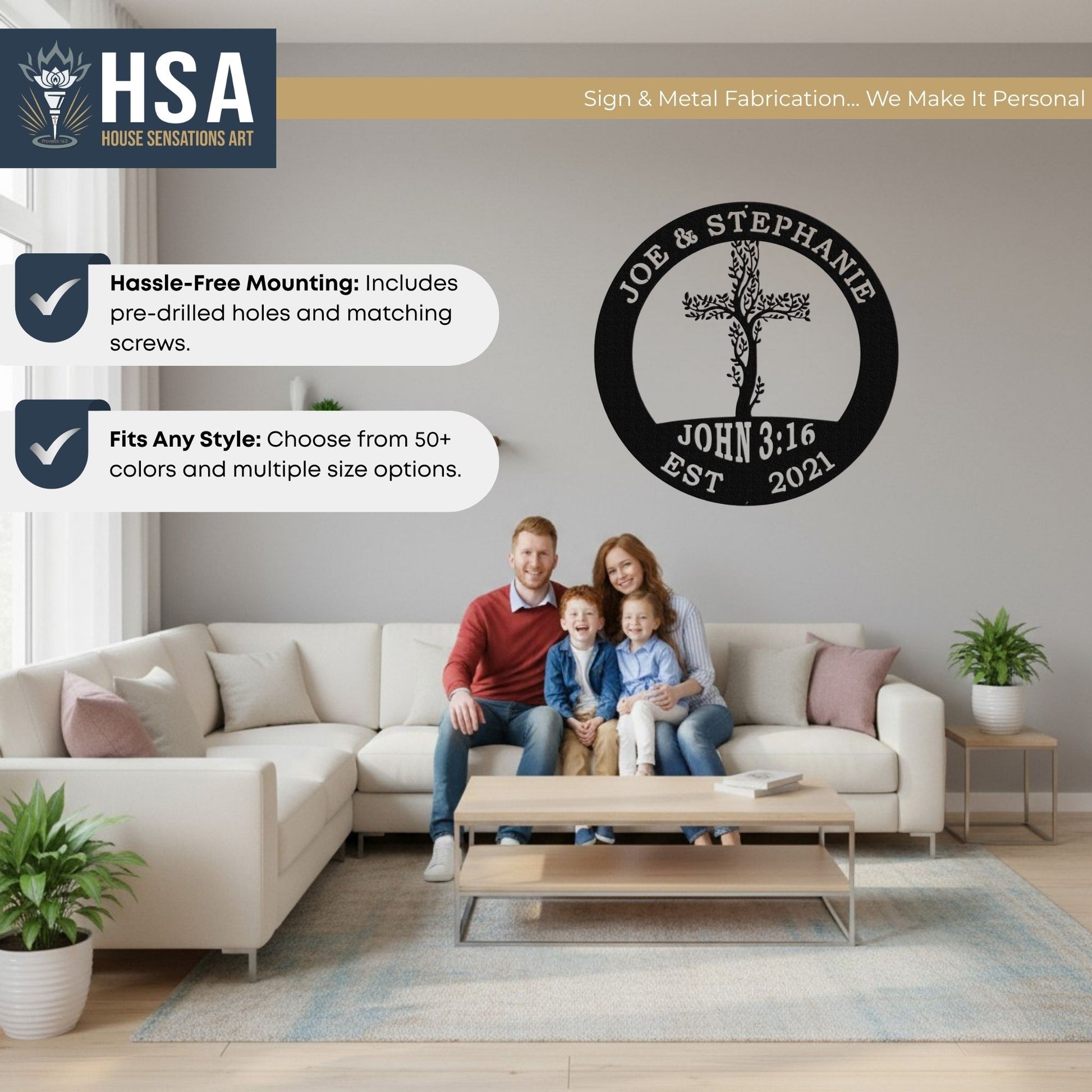 Bring a symbol of faith into your home with our Cross Tree of Life sign—hand‑crafted in the USA from heavy‑duty steel, powder‑coated for indoor/outdoor use. Featuring the scripture John 3:16 (“For God so loved the world…”), personalize it with your family name or custom text for a meaningful décor piece or gift.
